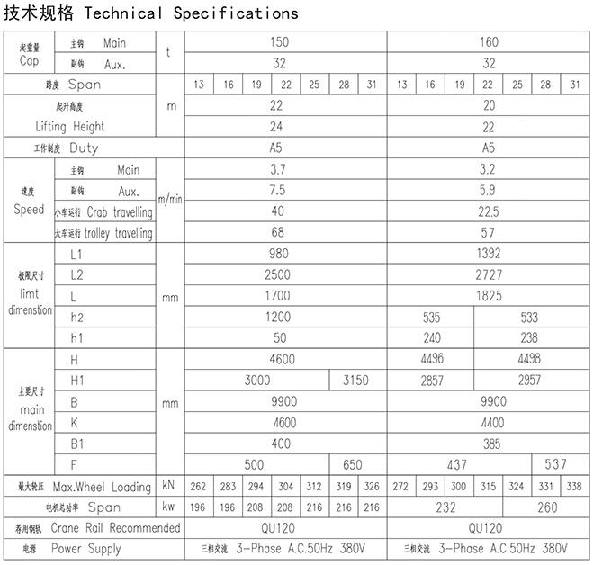 QD型125、32t~160、32t吊鉤橋式起重機